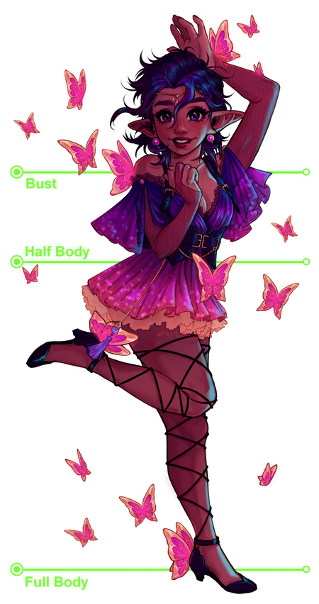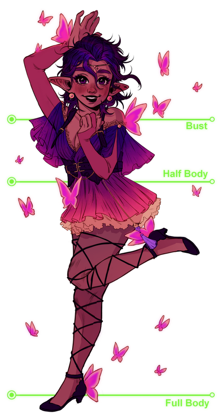 Full Body - at least 80% of the body though feet might get cut to fit a pose or client's vision. So long as most of the legs are seen however it will count towards this tier❁❁❁❁❁❁❁